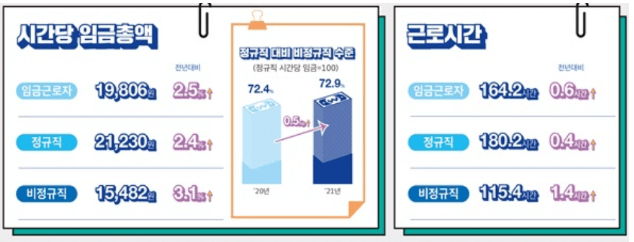 비정규직 근로자의 경우 정규직 근로자 대비 적은 시급 15,482원을 받고 일하며 대신 상대적으로 적은 시간인 일 기준 6시간 정도를 근무하고 있다. 비정규직은 무조건 없애야만 하는 제도인 것처럼 언론에서 나쁘게만 말하는 경향이 있는데 사실은 풀타임 근무가 힘든 상황에서 구직자들이 비정규직을 원하는 수요도 상당하고 기업들도 단기 인력을 채용해야 하는 상황에서 비정규직을 금지하면 기존 인력으로 대체해버리는 등 취업시장을 위축시키는 부작용도 있으므로 꼭 나쁜 것만은 아니다.